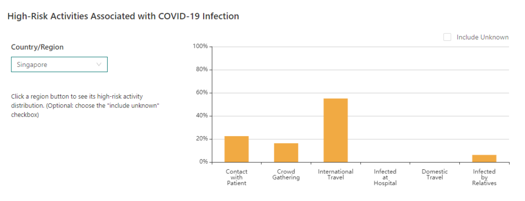 In addition, based on open-source data from four different regions, the page provides a unified view of data analysis on high-risk activities associated with COVID-19, making it easy to compare transmission data differences among regions. For example, crowd gathering is the most distributed high-risk activity in France, while “International Travel” is the leading high-risk activity in Singapore.