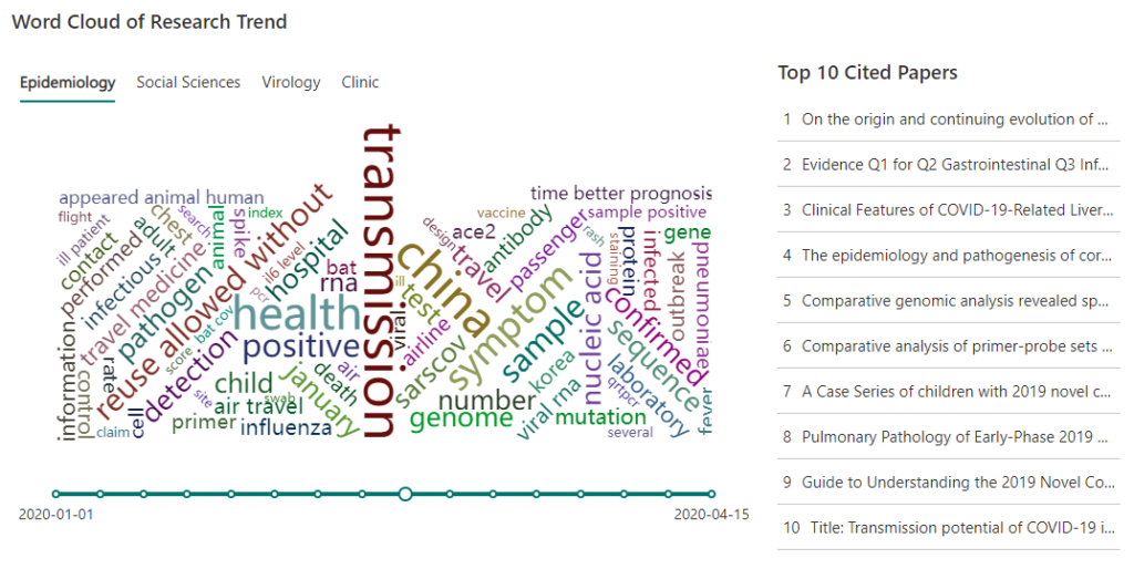 On the “Research Trends” page, visitors can learn about the most cited papers and changing research trends related to the novel coronavirus through data visualization. Researchers use automatic clustering technologies to summarize keywords and build a word cloud, showing changes in time granularity through weekly updates, which they hope will bring further inspiration to other researchers.
