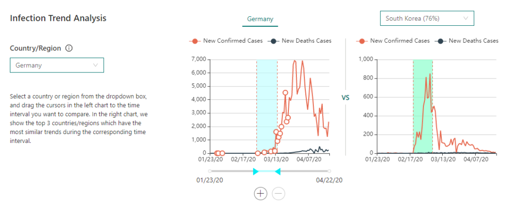 The “Infection Data Analysis” page presents cross-country/region comparisons of transmission dynamics. For example, through analysis, researchers found that the data trend in Germany from February 27 to March 14 closely resembled the data trend in South Korea from February 18 to March 5, and so the containment measures taken in South Korea after March 5 can serve as a more accurate reference for Germany in mid-March.
