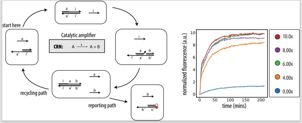 In our Journal of the American Chemical Society paper, we take the first step toward demonstrating in lab that our architecture can implement CRNs, showing the fundamentals of PSD systems and designing an in vitro catalytic amplifier. A catalytic amplifier is a unimolecular reaction with two outputs, but one of the outputs is also input. A catalytic amplifier is a strong proof of concept. Not only is it a show of complex DNA design, but it’s also sustainable.