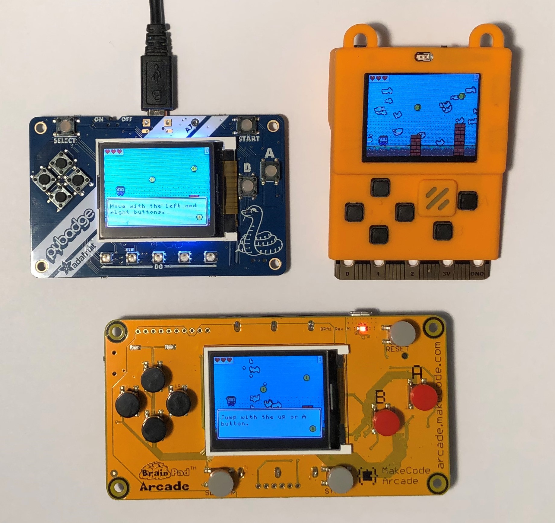 While memory usage requirements initially guided the design of the MakeCode runtime system and slow execution time isn’t generally a significant problem for most MakeCode editors, execution performance became paramount with Arcade. Arcade sports a 160 × 120 pixel screen with a palette of 16 colors, a four-channel retro-appropriate sound synthesizer, and six game buttons plus menu and reset. Arcade hardware runs on MCUs with around 100 KB of RAM running at around 100 megahertz.