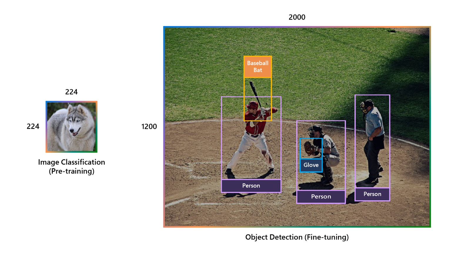 Another difficulty with large vision models is that the image resolution discrepancy between pretraining and fine-tuning can be large: pretraining is typically carried out at low resolutions, while many downstream vision tasks require high-resolution input images or attention windows, as shown in Figure 3.
