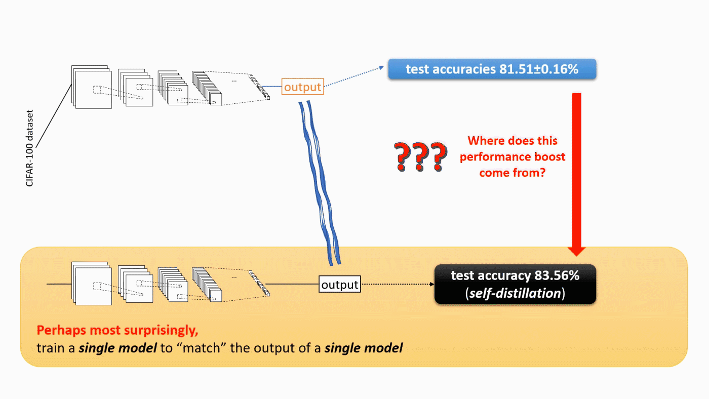 Mystery 3: Self-distillation. Note that knowledge distillation at least intuitively makes sense: the teacher ensemble model has 84.8% test accuracy, so the student individual model can achieve 83.8%. The following phenomenon, called self-distillation (or “Be Your Own Teacher (opens in new tab)”), is completely astonishing—by performing knowledge distillation against an individual model of the same architecture, test accuracy can also be improved. (See Figure 2 above.) Consider this: if training an individual model only gives 81.5% test accuracy, then how come “training the same model again using itself as the teacher” suddenly boosts the test accuracy consistently to 83.5%?