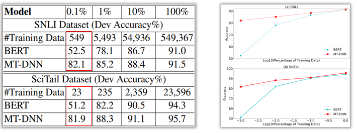 The authors of the MT-DNN paper compared MT-DNN with BERT in domain adaption, where both models are adapted to a new task by gradually increasing the size of in-domain data for adaptation. The results on the SNLI and SciTail tasks are presented in the following table and figure. With only 0.1% of in-domain data (which amounts to 549 samples in SNLI and 23 samples in SciTail), MT-DNN achieves +80% in accuracy while BERT’s accuracy is around 50%, demonstrating that the language embeddings learned by MT-DNN are substantially more universal than those of BERT.