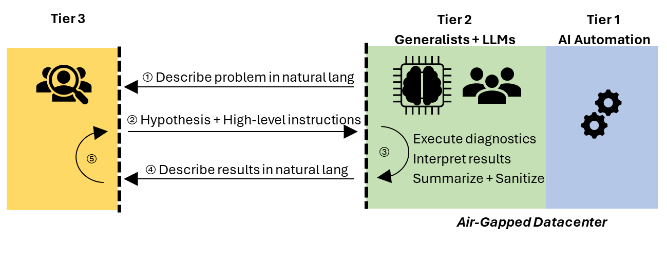 In an interactive session (Figure 4), an LLM with access to the air-gapped datacenter systems could summarize and sanitize the problem description in natural language (①). A remote expert in Tier 3 would then formulate hypotheses and send high-level instructions in natural language for more investigation or for mitigation (②). The LLM could use the high-level instructions to form a specialized plan. For example, it could query devices with a knowledge of the datacenter topology that the expert does not have; interpret, summarize, and sanitize the results (with or without the help of the generalist, on-site operators) (③); and send the interpretation of the results back to the experts, again in natural language (④). Depending on the problem, this cycle could repeat until the problem is solved (⑤). Crucially, while the operators at the air-gapped cloud would be in the loop, they wouldn’t need deep expertise in all systems to perform the required actions and interpret the results.