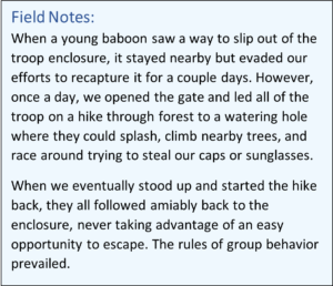 Most surprising, we saw astonishing inconsistencies in behavior. When temporarily alone, young primates tried things that they never did when they were close to peers and “alpha adults”—in this case, us volunteers.