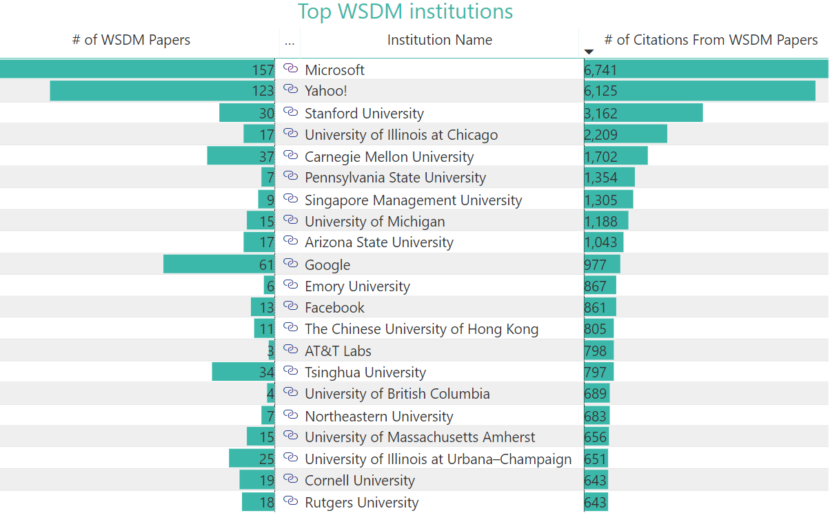 The bubble chart visualizes the top institutions at WSDM by citation count from their accepted WSDM papers. The color saturation of the bubble is proportional to the total number of publications from that institution that were accepted by WSDM.