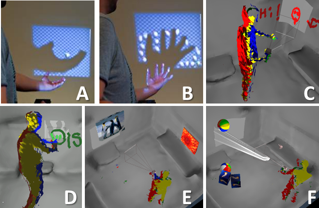 - C) Sensing projector pose, user’s hands (rendered green), and implementing a flashlight metaphor to enable writing and painting using the real shadow.