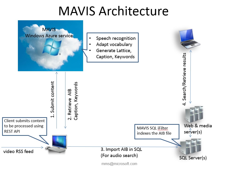 The Microsoft Audio Video Indexing Service (MAVIS) uses state of the art speech recognition technology developed at Microsoft Research to enable searching of audio and video files with speech. Additionally, MAVIS automatically generates closed captions and keywords which can increase accessibility and discoverability of audio and video files with speech content. MAVIS is available as a cloud service running on the Windows Azure platform.