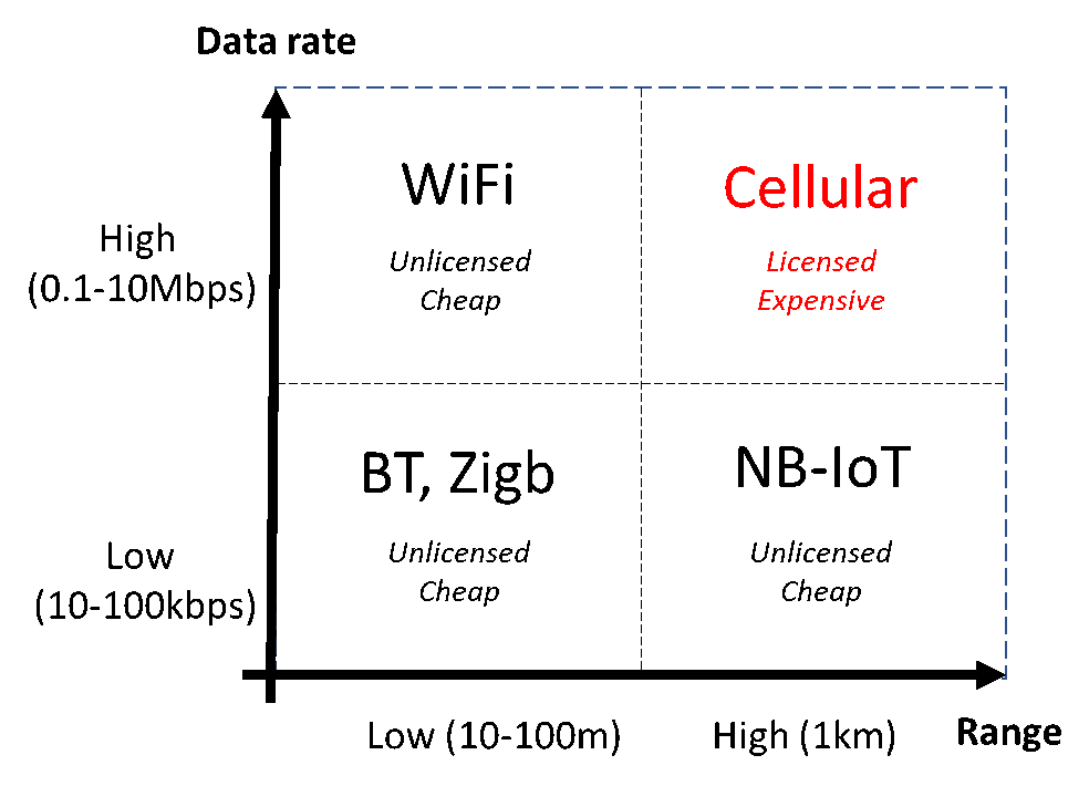 Equally, long-range, high-bandwidth connectivity may be an opportunity for novel IoT scenarios. Some high-bandwidth scenarios, such as smart cities, video analytics or robot navigation, cannot be supported by narrow-band IoT technologies (because of excessive bandwidth), Wi-Fi (because of limited range) or conventional cellular network (because of high cost).