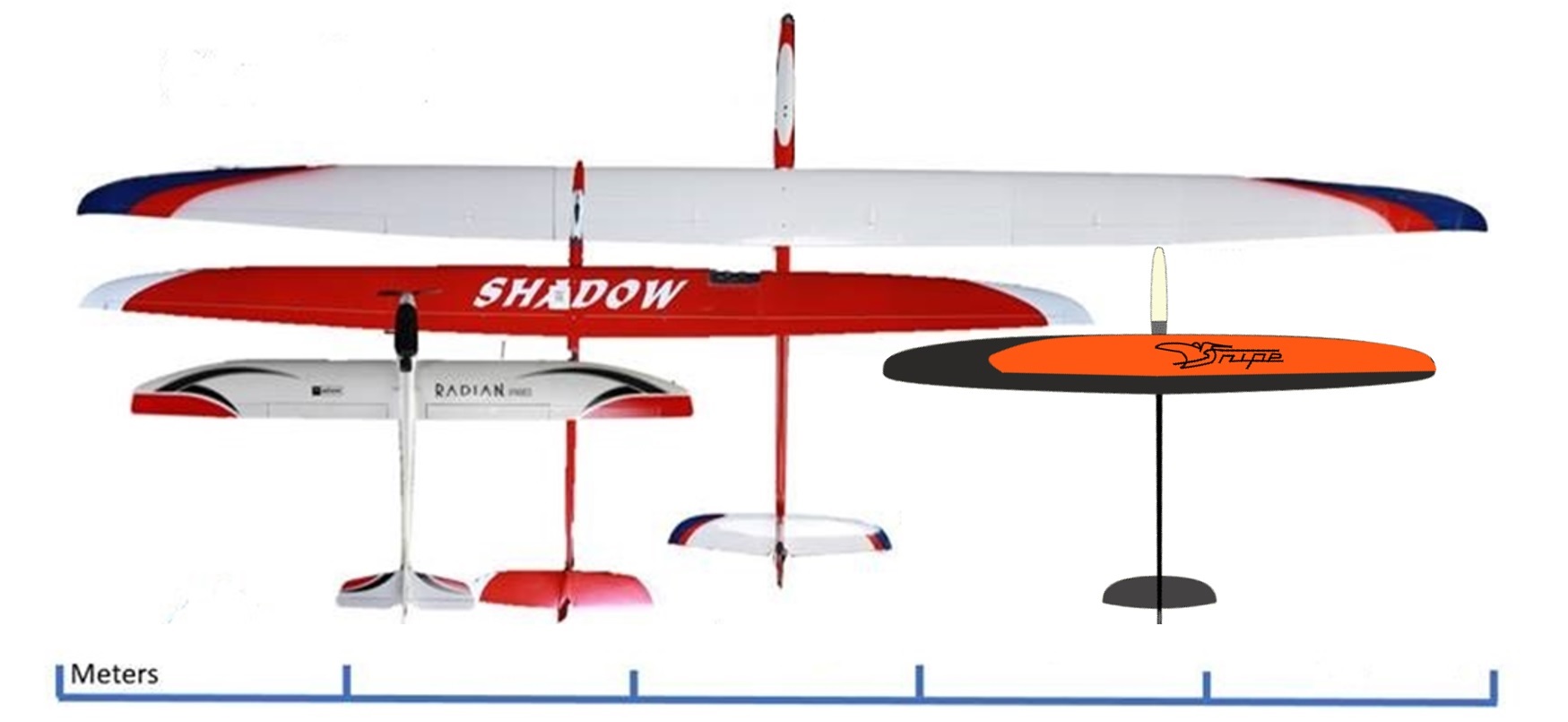 Our sUAV fleet currently consists of 1 Thermik XXXL (5m wingspan), 1 F3J Shadow (3.5m wingspan), several Radian Pros (2m wingspan), and 1 Snipe-2 (2.15m wingspan). Onbard equipment varies slightly depending on the airframe type, but always includes a GPS, compass, telemetry radio, RC receiver, pitot/static sensor, barometer, IMU, and a computer for fully autonomous flight.