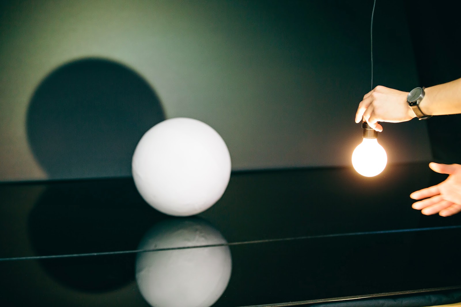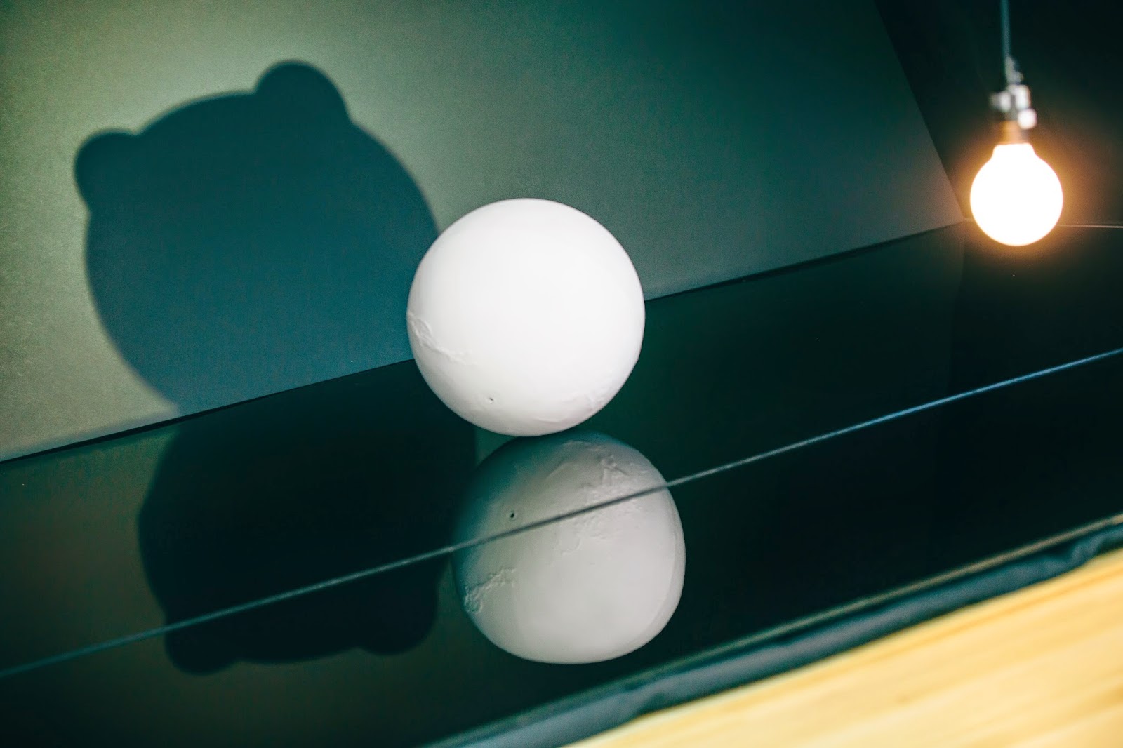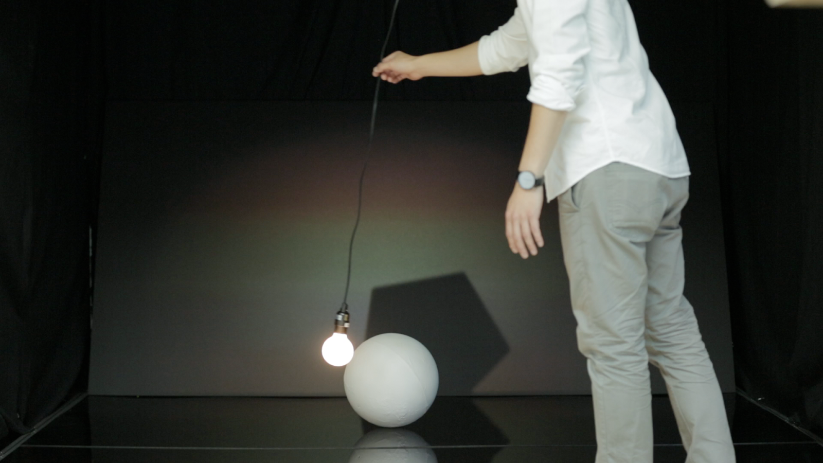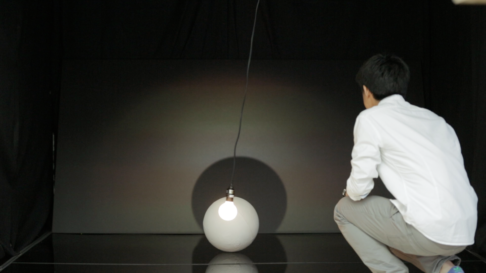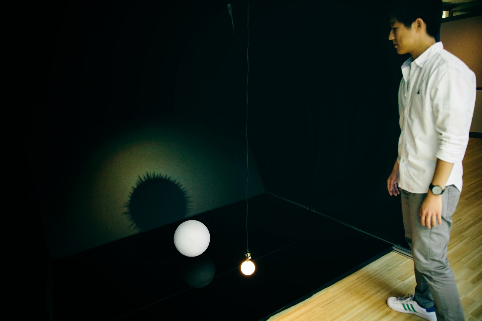 The entire installation was set up in a cubic structure of 8 feet x 8 feet x 8 feet. Three entities (a white ball, a light bulb, and a shadow) are presented to the viewers. Using Kinect and Pointgrey cameras, we track the viewers’ activities as well as the position of the ball and the light bulb. The shadow’s size/position is computed based on tracked positions of the ball and the light bulb; therefore, moving either of them will change the size and position of the shadow. An Optoma projector is used to create lighting and shadow effects.