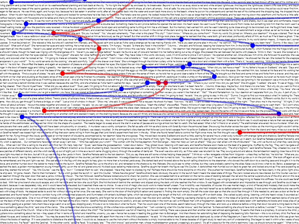 Figure 3: Fragment of Whole Text Visualization Highlighting Lyra and Will’s names (click for larger version)