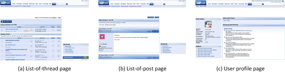 In a website, pages are generated based on distinguishable templates according to their functions. That is to say, visually similar pages usually have same function. In this way, user can easily identify a page’s function at a glance. Following are several typical layout templates identified from the ASP.NET Forums. Their functions are to show a) a list of discussion thread, b) a list of thread posts, and c) user profile, respectively.