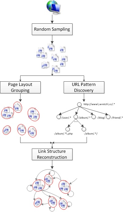 To automatically discover the organization structure of a given website, an unsupervised pipeline was proposed in this project. The basic idea is to first sample a few pages randomly from the target website, then discover layout template and URL patterns by grouping these sampled pages, and finally reconstruct the link graph. Figure 3 shows the flowchart of the pipeline, which consists of four components: random sampling, page layout grouping, URL pattern discovery, and link structure reconstruction.