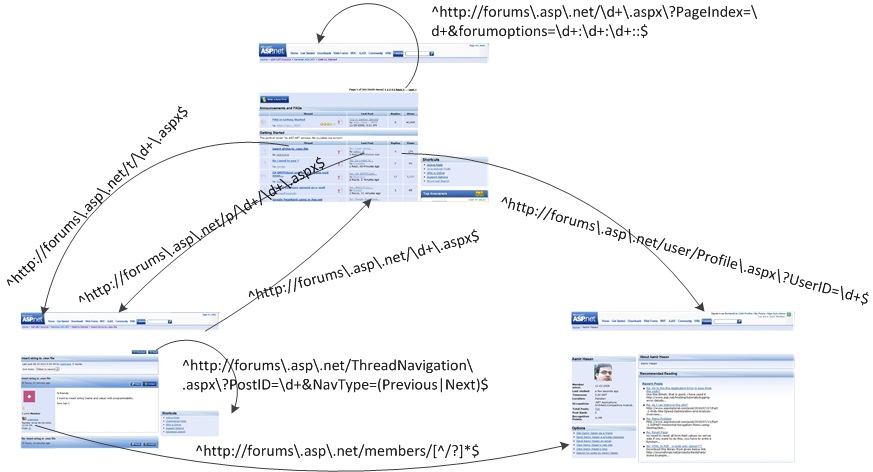 A URL pattern is a generalization of a group of URLs sharing similar syntactic format. In general, a URL pattern can be represented with a regular expression. Following we show some example URL patterns discovered, again, from the ASP.NET Forums.