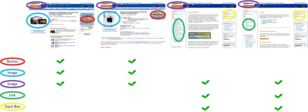 Pages with similar layout usually have similar HTML components. Fig. 4 gives an illustrative example. In Fig. 4 there are four pages from the website of Amazon, two of them are detailed pages of product introduction; while the other two are pages of help. Some salient HTML components in these four pages are marked with color ellipses. It is clear that similar layout have similar HTML components.