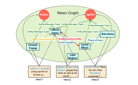 Knowledge graph, which contains rich knowledge facts and well structured relations, is an ideal auxiliary data source for alleviating the data sparsity issue and improving the explainability of recommender systems. However, preliminary studies usually simply leverage a generic knowledge graph which is not specially designed for particular tasks. In this paper, we consider the scenario of news recommendations. We observe that both collaborative relations of entities (\eg entities frequently appear in same news articles or clicked by same users) and the topic context of news article can be well utilized to construct a more powerful graph for news recommendations. Thus we propose an enhanced knowledge graph called \textbf{news graph}. Compared with a generic knowledge graph, the news graph is enhanced from three aspects: (1) adding a new group of entities for recording topic context information; (2) adding collaborative edges between entities based on users’ click behaviors and co-occurrence in news articles; and (3) removing news-irrelevant relations. To the best of our knowledge, it is the first time that a domain specific graph is constructed for news recommendations. Extensive experiments on a real-world news reading dataset demonstrate that our news graph can greatly benefit a wide range of news recommendation tasks, including personalized article recommendation, article category classification, article popularity prediction, and local news detection.
