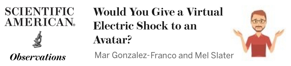 Recently, we took another look at obedience, drawing on Milgram’s tests, but safely within the realm of virtual reality. We recorded a real actor’s performance, using a cutting-edge Hollywood-type motion capture setup, and portrayed the actor and his movements as a virtual human character (an “avatar’).