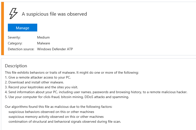 Windows Defender ATP ML can also detect suspicious documents used by Chanitor malware (also known as Hancitor), generically flagging suspicious behaviors, including memory injection activities. These ML detections include enough context for SecOps personnel to understand why the documents have been flagged. Like many crafted malicious documents, Chanitor documents are often capable of bypassing signature-based solutions.