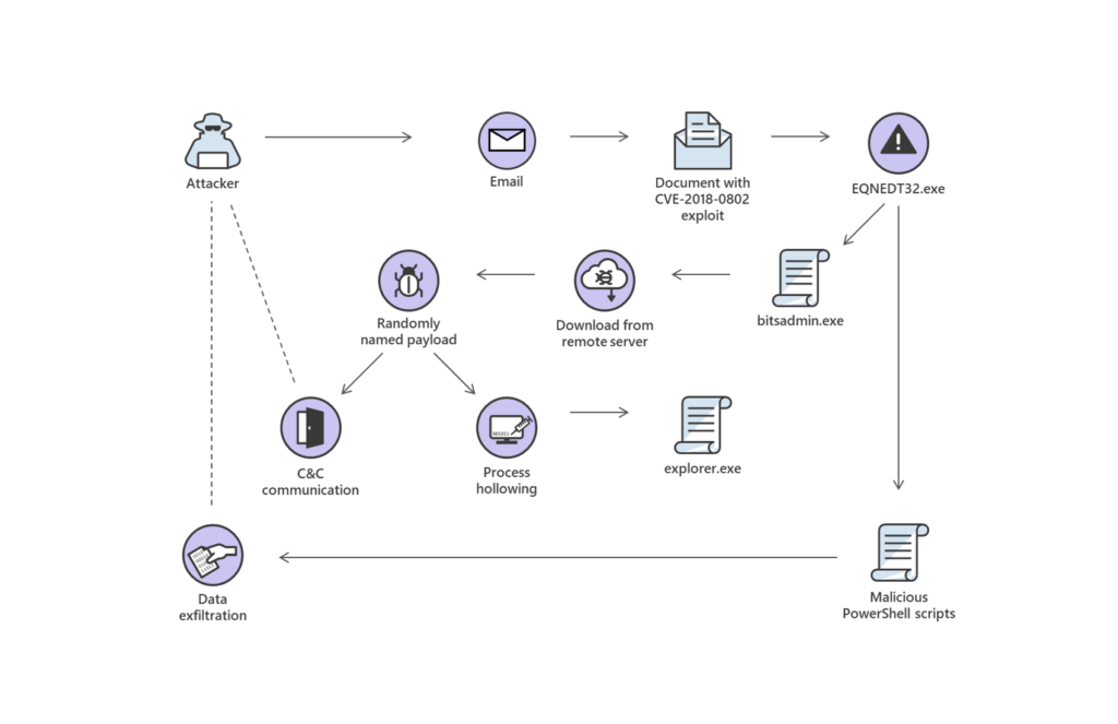 The first detection related to the attack was fired by a suspicious EQNEDT32.exe behavior, which led us to the entry vector of the attack: a malicious document that carried an exploit for CVE-2018-0802, a vulnerability in Microsoft Office Equation Editor, which the actor known as Tropic Trooper has exploited in previous campaigns. Using Office 365 ATP Threat Explorer, we found the specific emails that the attackers used to distribute the malicious document.