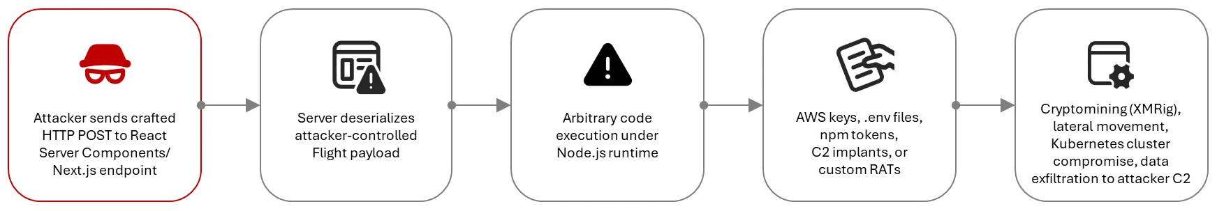 We identified several hundred machines across a diverse set of organizations compromised using common tactics, techniques, and procedures (TTPs) observed with web application RCE. To exploit CVE-2025-55182, an attacker sends a crafted input to a web application running React Server Components functions in the form of a POST request. This input is then processed as a serialized object and passed to the backend server, where it is deserialized. Due to the default trust among the components, the attacker-provided input is then deserialized and the backend runs attacker-provided code under the NodeJS runtime.