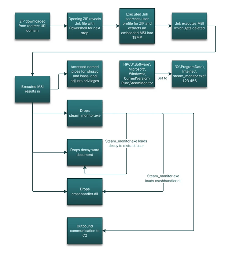 PowerShell then launched the legitimate steam_monitor.exe, which was leveraged to side-load the malicious crashhandler.dll. That DLL decrypted crashlog.dat and executed the final payload in memory, ultimately establishing an outbound connection to an external C2 endpoint.