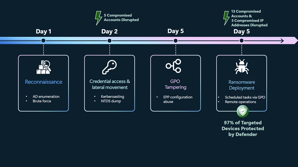 - Roughly 97% of devices the attacker attempted to encrypt were fully protected by Defender. A limited number of devices experienced encryption during concurrent ransomware activity over SMB; however, attack disruption successfully contained the incident and stopped further impact.