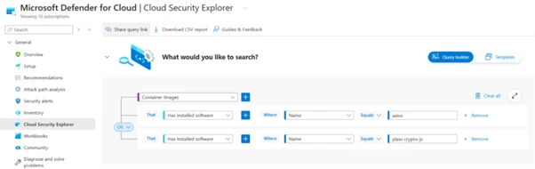 Microsoft Defender for Cloud customers can use cloud security explorer to surface possibly compromised software packages. The following screenshot represents a query that searches for container images with the axios or plain-crypto-js node packages.