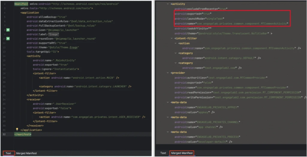 The vulnerability was identified in an exported activity (MTCommonActivity) that gets added to an application’s Android manifest once the library is imported into a project, after the build process. This activity only appears in the merged manifest, which is generated post-build (see figure below), and therefore is sometimes missed by developers. Consequently, it often escapes detection during development but remains exploitable in the final APK.