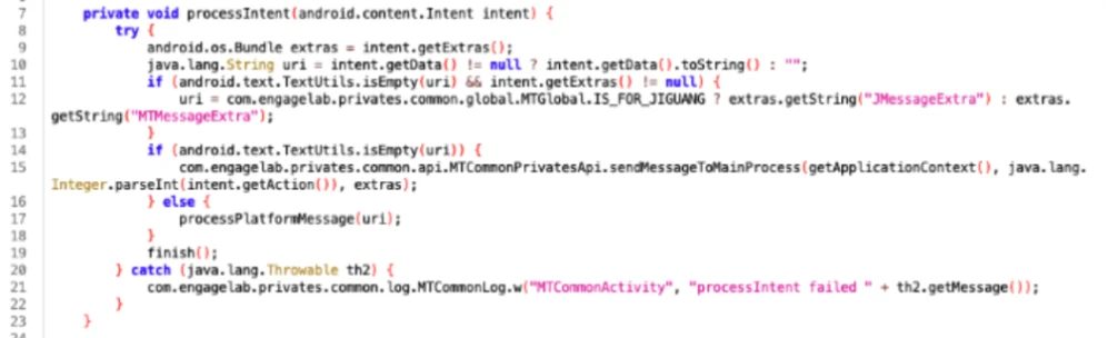This method (see figure below) begins by initializing the uri variable on line 10 using the data provided in the incoming intent. If the uri variable is not empty, then – according to line 16 – it invokes the processPlatformMessage():