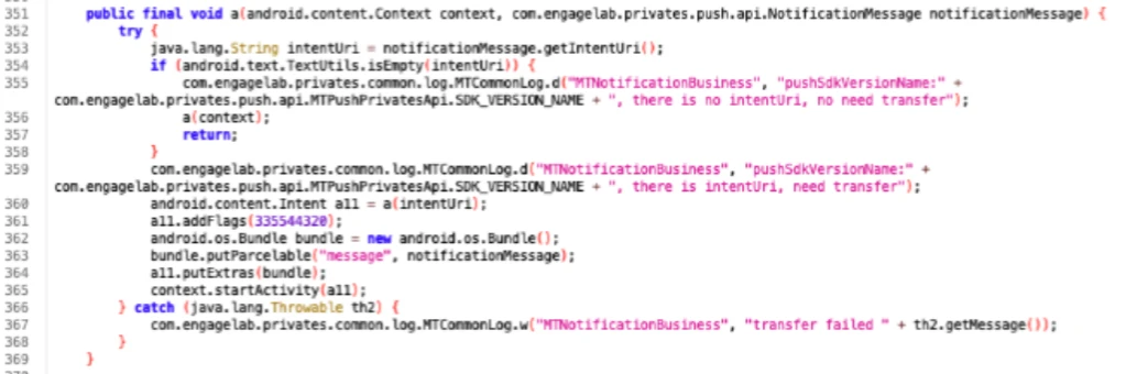 On line 353, the method above obtains the intentUri value and attempts to create a new intent from it by calling the method a() on line 360. The returned intent is subsequently dispatched using the startActivity() method on line 365. The a() method is particularly noteworthy, as it serves as the primary mechanism responsible for intent redirection: