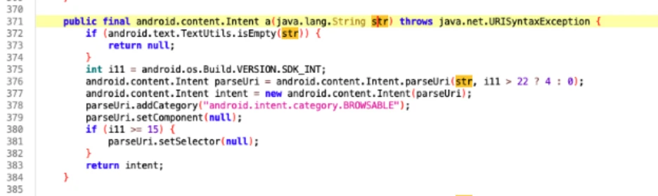 However, as observed on line 377, the method also instantiates a second intent variable — its purpose not immediately evident—which incorporates an explicit intent. Crucially, this explicitly targeted intent is the one returned at line 383, rather than the benign parseUri intent.