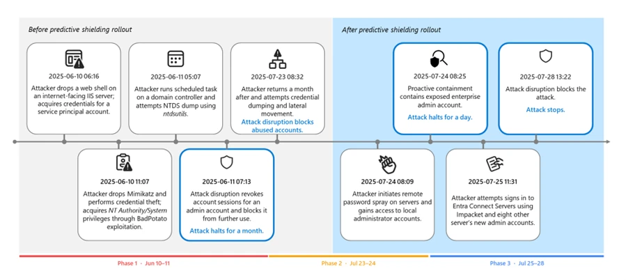 Attack disruption in Defender repeatedly severed sessions and blocked new sign-ins made by the threat actor. On July 28, 2025, the attack campaign lost momentum and stopped.