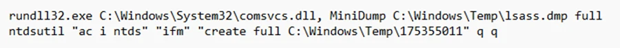 In the final phase of the attack, the threat actor attempted a full LSASS dump on a file sharing server using comsvcs.dll MiniDump under a domain user account, followed by additional NTDS activity: