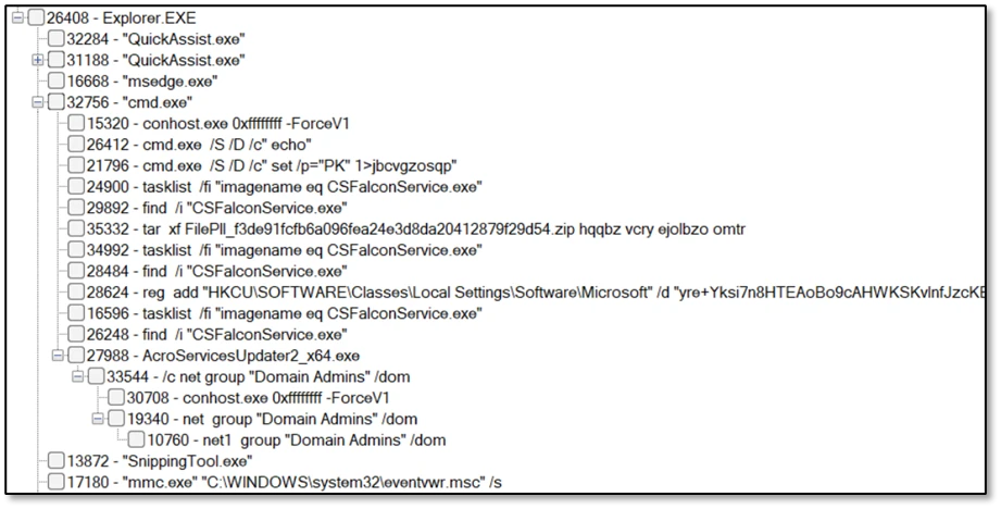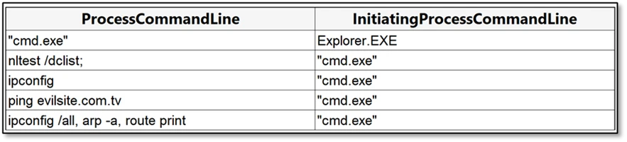 Immediately after establishing control through Quick Assist, the attacker typically spends the first 30–120 seconds assessing their level of access and understanding the compromised environment. This is often reflected by a brief surge of cmd.exe activity, used to verify user context and privilege levels, gather basic system information such as host identity and operating system details, and confirm domain affiliation. In parallel, the attacker might query registry values to determine OS build and edition, while also performing quick network reconnaissance to evaluate connectivity, reachability, and potential opportunities for lateral movement.