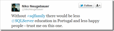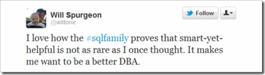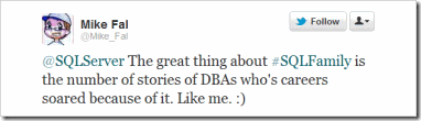 “SQL Family is needing 30 minutes to walk the 150 yards from the hotel entrance to the elevators because I keep bumping into people that I know. It’s knowing that I’ll never ride the escalator without passing a few friends going the other way. It’s the assurance that I’ll never again be that guy in the hotel room at 9pm wishing I was still engaged in the event.”