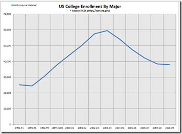 Now, the bad news. While enrollments have seen an exponential growth since 2000, computer-related degrees has seen a dramatic decline (source: US Department of Education, NCES) since 2003. At the same time, IT is one of the major job creators in the economy with database-related fields having less than a 1% unemployment rate (source: CareerBuilder). This is causing many of the largest companies to send more IT jobs overseas to cover the shortage in talent.