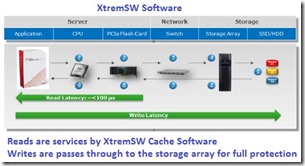 The introduction of PCIe Flash moves the storage resource as close to the CPU as possible, providing tremendous gains in IOPS (I/O per second) and reduced response time (measured in microseconds). The closer you can get to the CPU, the more performance gain you’ll see. EMCs XtremSF (Server Flash) does exactly that, moving IO as close to the CPU as possible. The EMC XtremSF 2200 can provide around 208,000 IOPS at 87 microsecond response time (70/30 read/write 4k block). WOW!!! The downside is its local storage and needs to be protected and treated as local storage.