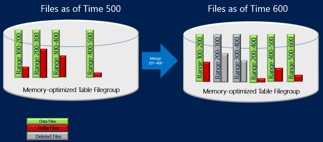 In the example below, the memory-optimized table file group has four data and delta file pairs at timestamp 500 containing data from previous transactions. For example, the rows in the first data file correspond to transactions with timestamp > 100 and <=200 or alternatively represented as (100, 200]. The second and third data files are shown to be less than 50% full after accounting for the rows marked deleted. The merge operation combines these two CFPs and creates a new CFP containing transactions with timestamp > 200 and <=400, which is the combined range of these two CFPs. You see another CFP with range (500, 600] and non-empty delta file for transaction range (200, 400] shows that Merge operation can be done concurrently with transactional activity including deleting more rows from the source CFPs.
