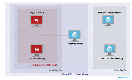 Other components required are a file share witness to guarantee quorum in the configuration to avoid “split brain” scenarios, and a domain controller to join all VMs to the same domain. Similar to the SQL replicas, there is a primary and secondary domain controller to prevent a single point of failure for the domain. The SQL replicas are deployed to an availability set to ensure they are in different Azure failure and upgrade domains. Likewise, the domain controller replicas are in their own availability set. The configuration is depicted in the image below.
