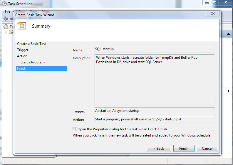 - Arguments: –file ‘C:\SQL-startup.ps1’
