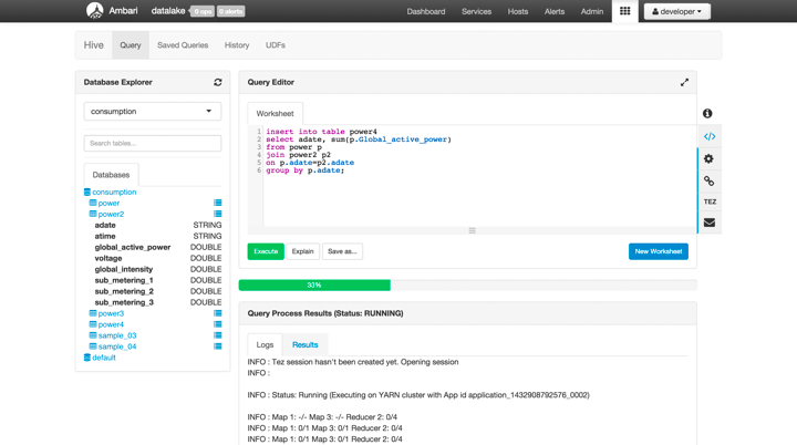 With HDP 2.3 we focus on the SQL developer and provide an integrated experience that allows for SQL query building, displaying a visual “explain plan”, and allowing for an extended debugging experience when using the Tez execution engine. A screenshot of what we’ve developed shown below: