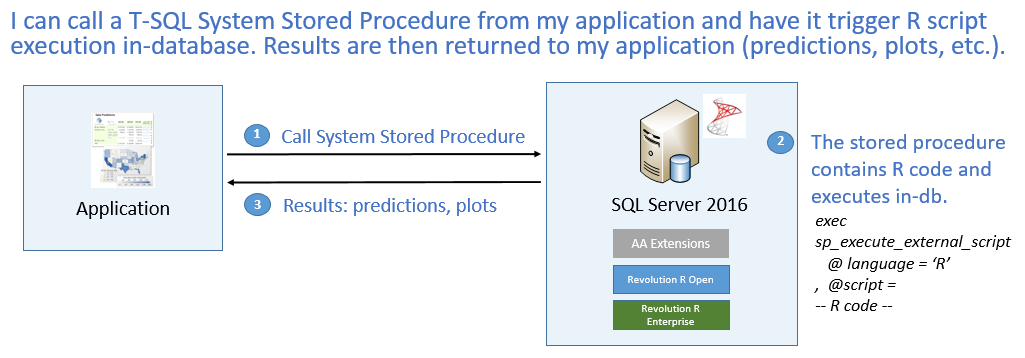 For SQL Server 2016 CTP3, we support ad-hoc execution of R scripts via a new system stored procedure. This stored procedure will support pushing data from a single SELECT statement and multiple input parameters to the R side and return a single data frame as output from the R side.