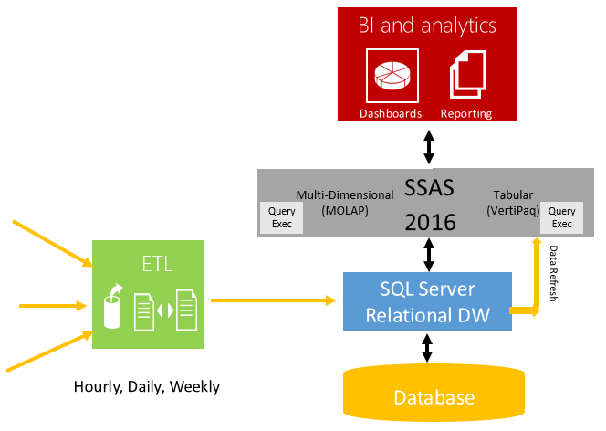 Traditionally, customers have modeled the data using multidimensional online analytical processing (MOLAP) with pre-aggregated data or with Tabular Model and the source of data in the database with periodic ETL (Extract, Transform and Load). The picture below shows a typical deployment using SQL Server for relational DW and SQL Server Analysis Server (SSAS) for data modelling.