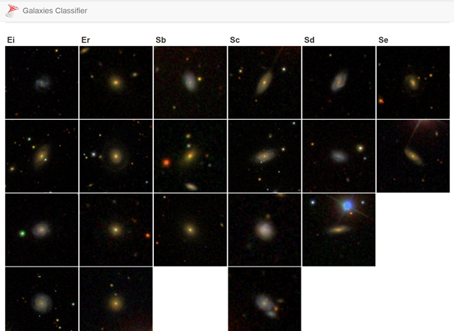 Imagine a simple web app that loads images from a folder and then classifies them into different categories – spiral or elliptical and then sub-types with those categories (e.g., is it a regular spiral or does it have a handlebar structure in the center).