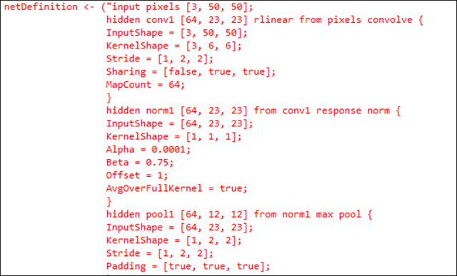 This new function – rxNeuralNet from the MicrosoftML package for training a DNN. The code looks similar to other R and rx functions – there is a formula, an input dataset, and some other parameters. One of the parameters here is this line “netDefinition = netDefinition”. This is where the neural network is being defined.