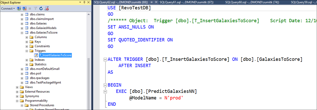 The trigger in turn invokes a stored procedure – PredictGalaxiesNN as shown below (with R script portion embedded inside the stored proc):