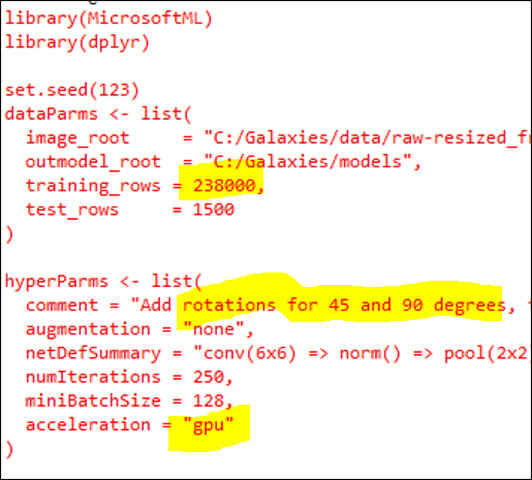 Some other lines to note here are – ‘training_rows = 238000’. This model was trained on 238K images that we got from Sloan Digital Sky Survey dataset. We then created two variants of each image with 45% and 90% rotations. In all there was about 700K images to train on. That’s a lot of image data to train on – so, how long did it take to train it? Well, we were able to train this model in under 4 hours. This is a decent sized machine – 6 cores and 56GB or RAM, but then it also has a powerful Nvidia Tesla K80 GPU. In fact, it is an Azure VM – the new NC series GPU VM, readily available to anyone with an Azure subscription. We were able to leverage the GPU computation by specifying one simple parameter: acceleration = “gpu”. Without GPU, the training takes roughly 10X more time.